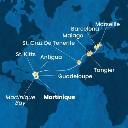 | 2. | 05.03.2027, Pá | 2. Pointe-à-Pitre (Guadeloupe) / Zámořský departement Francie | 08:00 | 23:00 |