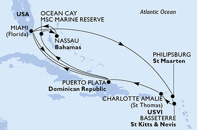 | 13. | 24.02.2028, Čt | 13. Ocean Cay MSC Marine Reserve (Ocean Cay) / Bahamy | 08:00 | 18:00 |