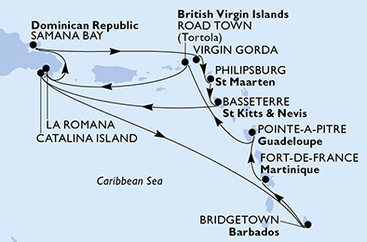 Dominikánská republika, Zámořské území Velké Británie, Svatý Kryštof a Nevis, Svatý Martin z La Romany na lodi MSC Opera