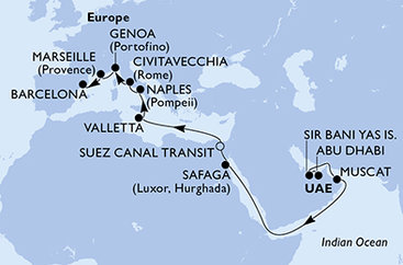 Spojené arabské emiráty, Omán, Egypt, Malta, Itálie, Francie, Španělsko z Abu Dhabi na lodi MSC World Europa