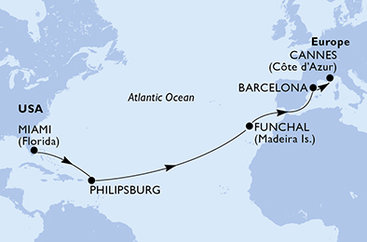 | Trasa: | USA, Svatý Martin, Portugalsko, Španělsko, Francie |