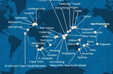 USA, Francouzská Polynésie, Fidži, Nová Kaledonie, Austrálie, Papua Nová Guinea, Japonsko, Jižní Korea, Tchaj-wan, Čína, Vietnam, Thajsko, Singapur, Malajsie, Srí Lanka, Maledivy, Mauricius, Jihoafrická republika, Namibie, Kapverdy, Španělsko, Francie, Itálie ze San Francisca na lodi Costa Deliziosa