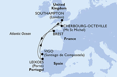 Velká Británie, Francie, Portugalsko, Španělsko ze Southamptonu na lodi MSC Meraviglia