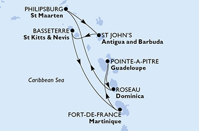 | 8. | 19.02.2028, So | 8. Fort-de-France (Martinik) / Zámořský departement Francie (Vylodění) | 07:00 | --:-- |