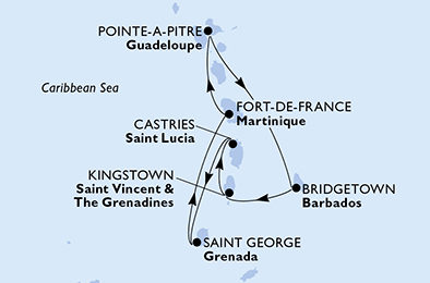 | 8. | 12.02.2028, So | 8. Fort-de-France (Martinik) / Zámořský departement Francie (Vylodění) | 07:00 | --:-- |