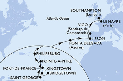 Barbados, Svatý Vincenc a Grenadiny, Grenada, Martinik, Guadeloupe, Svatý Martin, Portugalsko, Španělsko, Francie, Velká Británie z Bridgetownu na lodi MSC Meraviglia