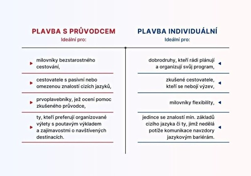 Rozhodnutí mezi plavbou s českým průvodcem a individuální plavbou závisí na vašich preferencích.