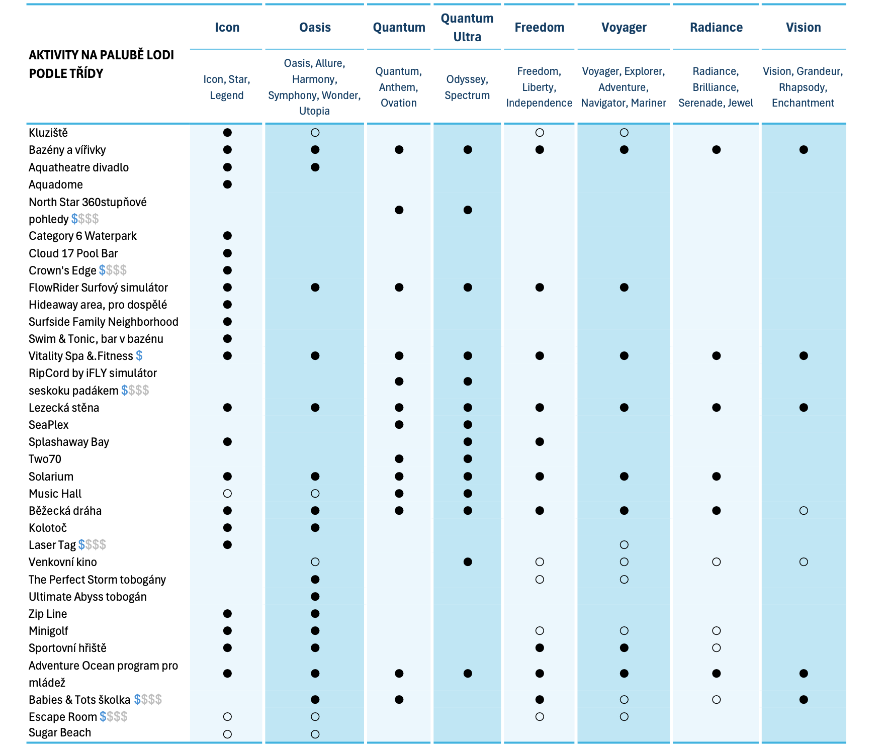 Orientační přehled aktivit, restaurací a barů na lodích najdete v tabulkách níže:
